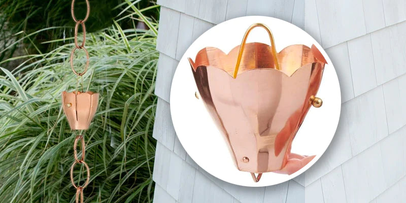Our rain chains come in various cup and link shapes, from simple circles to intricate flowers and motifs. Our large (wide and bold) cup designs look beautiful and effectively guide rainwater down the chain's length.