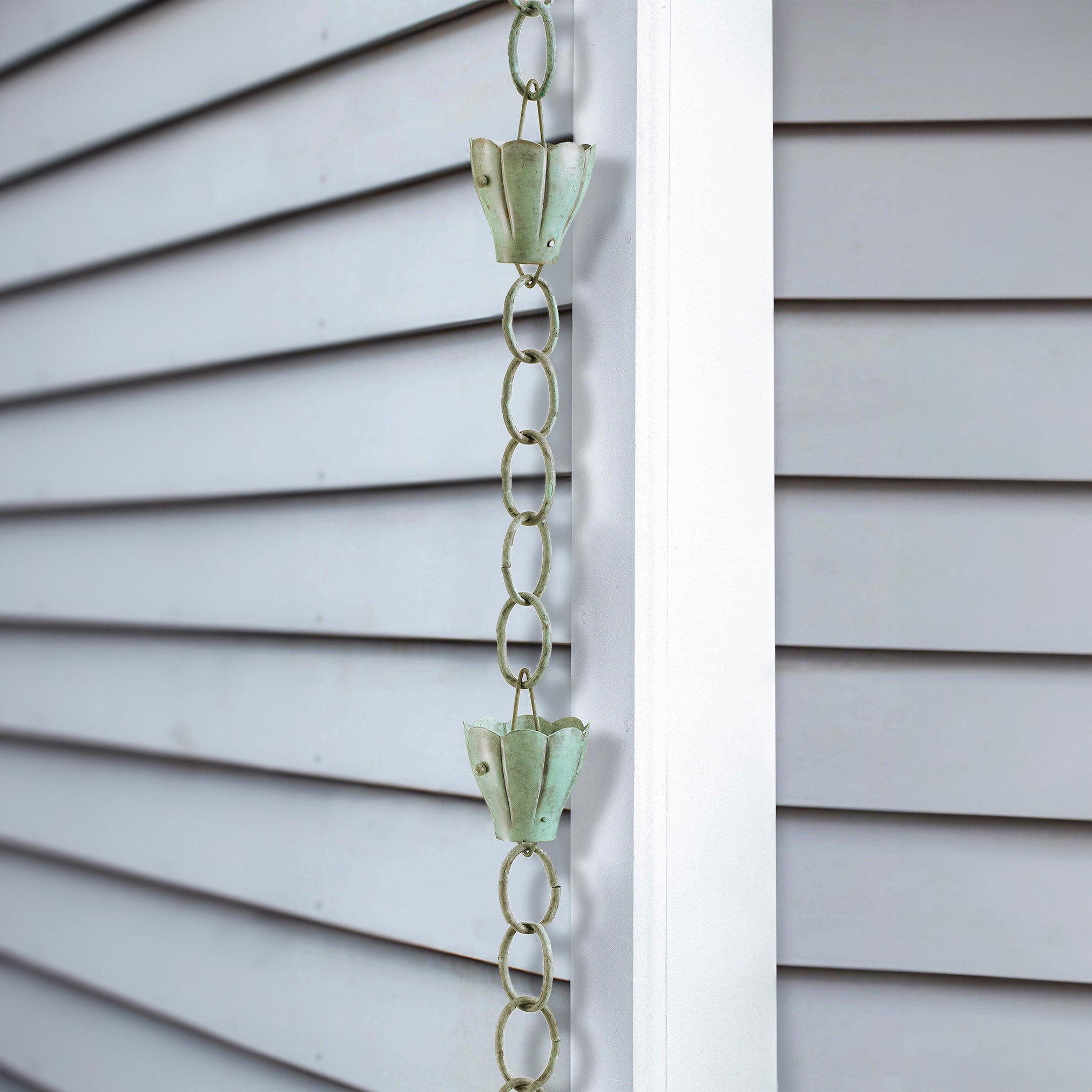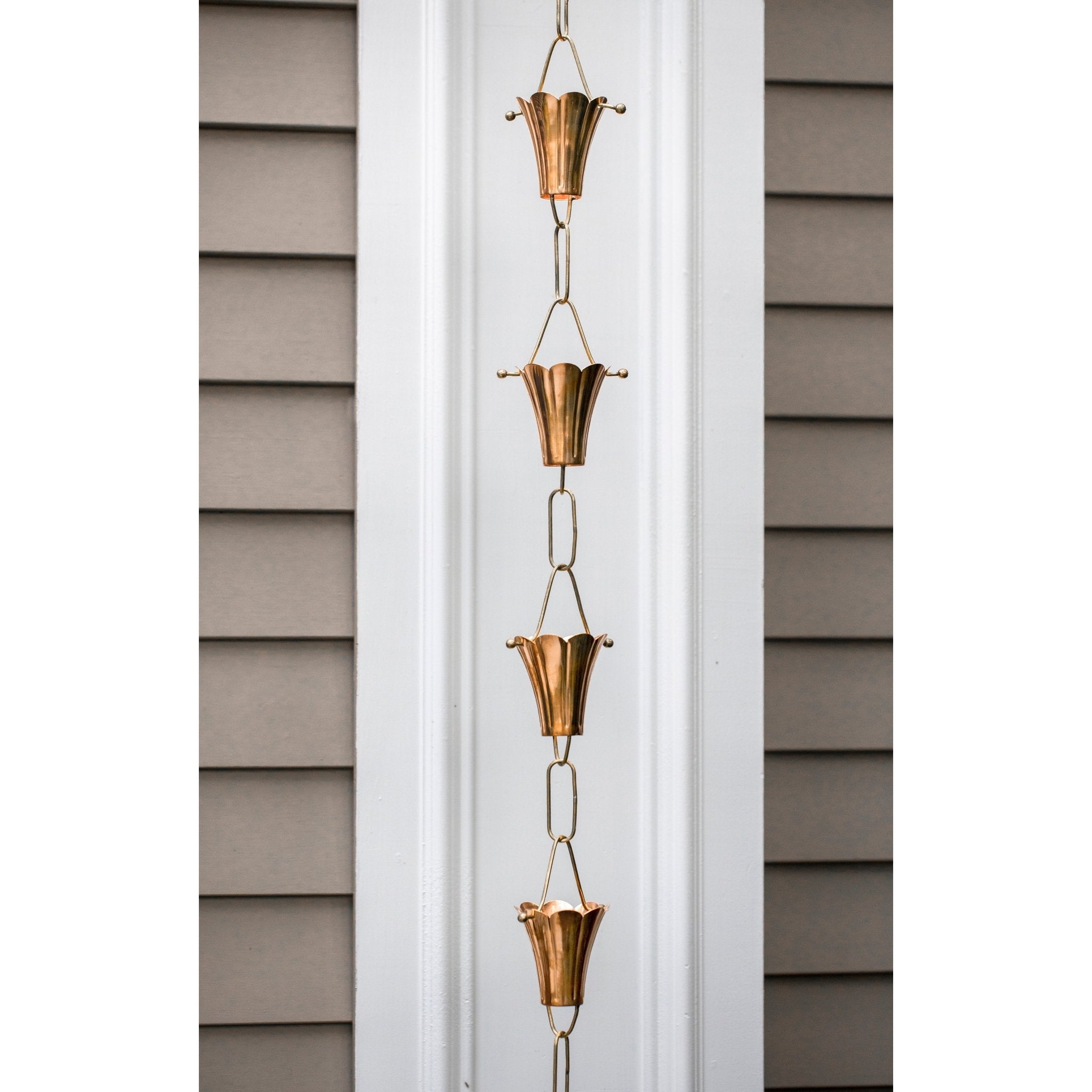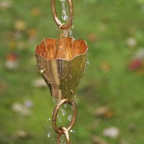 Our rain chains come in various cup and link shapes, from simple circles to intricate flowers and motifs. Our large (wide and bold) cup designs look beautiful and effectively guide rainwater down the chain's length.