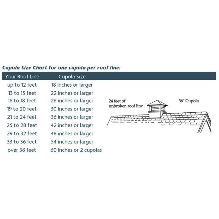 • Sizing & Features: DIMENSIONS – Square size measured at roofline. Fits up to a 10/12 pitch roof (most roofs). When calculating the size of your cupola, use our steadfast builder's rule of thumb: 1.5 inches of cupola width for every foot of unbroken roofline. See photo for more information.