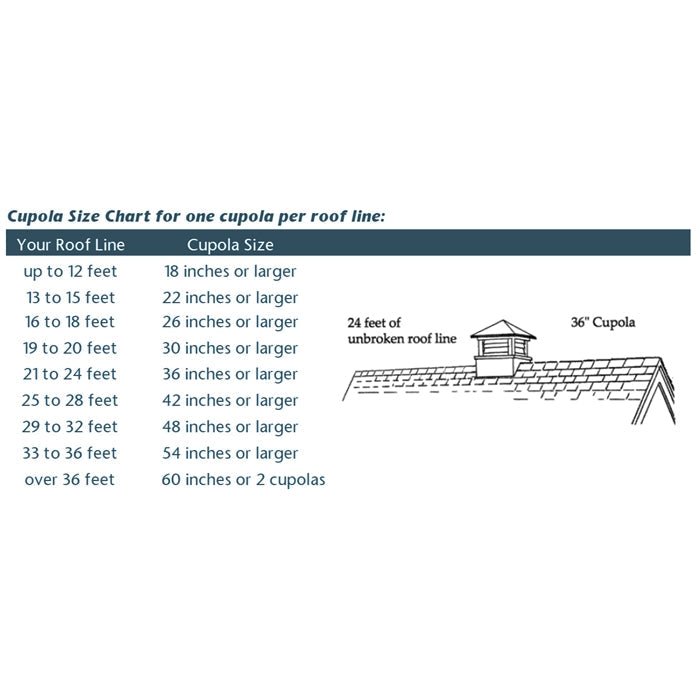 • Sizing & Features: DIMENSIONS – Square size measured at roofline. Fits up to a 10/12 pitch roof (most roofs). When calculating the size of your cupola, use our steadfast builder's rule of thumb: 1.5 inches of cupola width for every foot of unbroken roofline. See photo for more information.