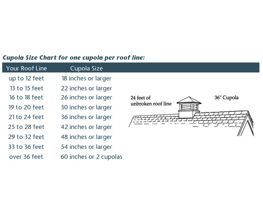 • Sizing & Features: DIMENSIONS – Square size measured at roofline. Fits up to a 10/12 pitch roof (most roofs). When calculating the size of your cupola, use our steadfast builder's rule of thumb: 1.5 inches of cupola width for every foot of unbroken roofline. See photo for more information.