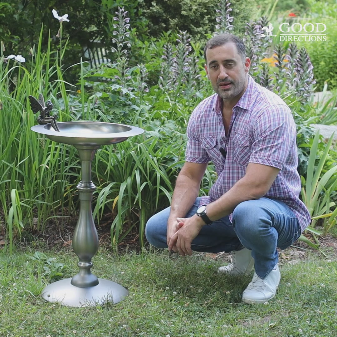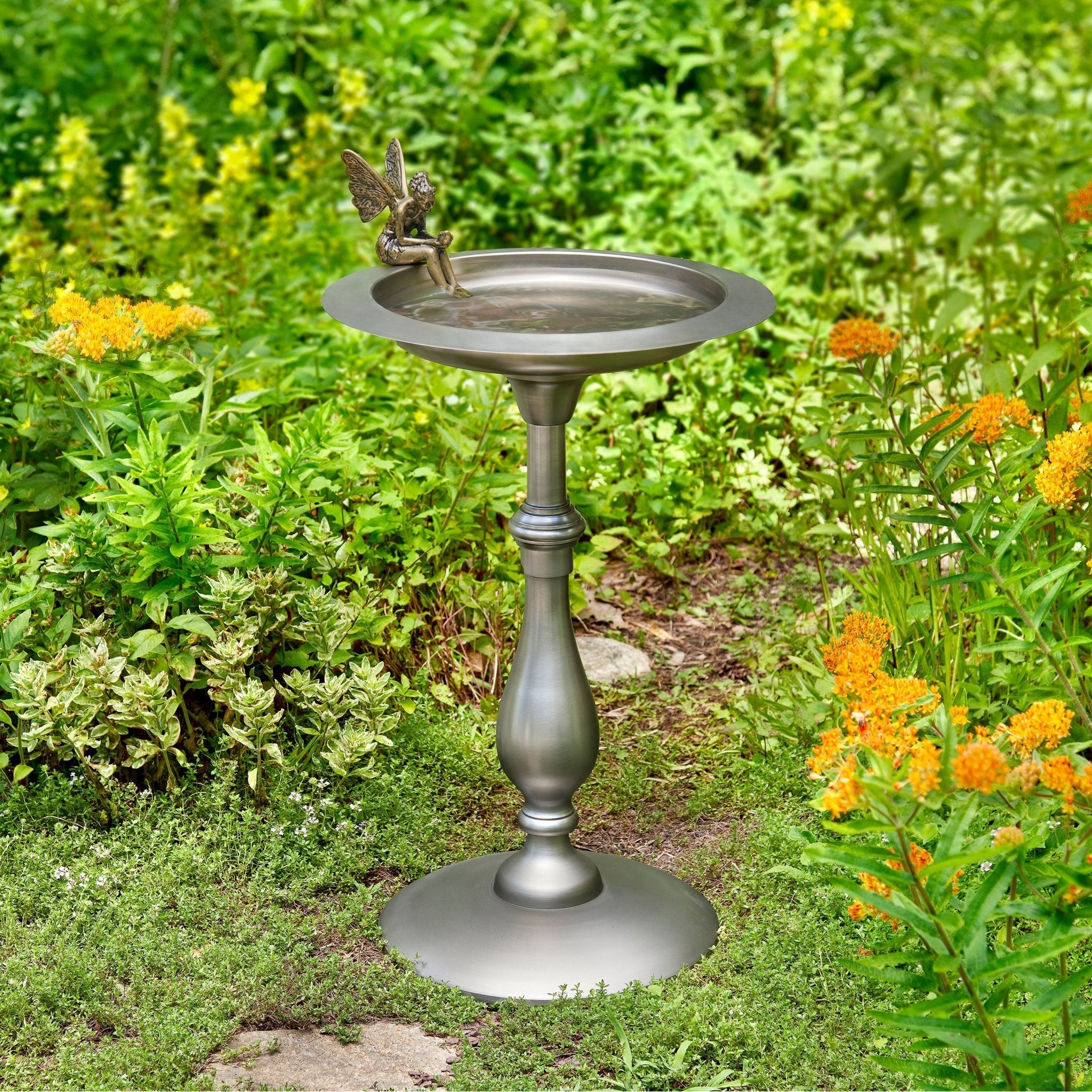 Welcome more birds to your backyard with the Classic Pedestal Bird Bath. The pedestal base is crafted from bird-safe cast aluminum and coated with a beautiful pewter finish. The basin is made of brass, which is safe for birds, and truly meant to last outdoors. The adorning focal point is the Fairy, incredibly detailed and made of cast aluminum. The Fairy securely rests on the edge of the basin. It's an ideal gift, enhancing your outdoor haven for bird enthusiasts.