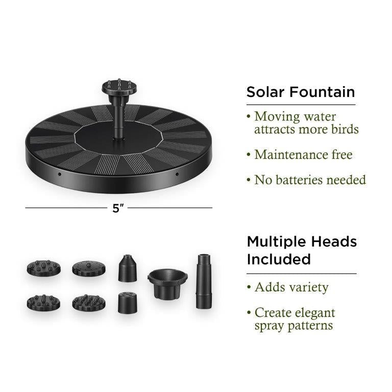 • New! - Solar Fountain included with the Bird Bath when selecting the "With Fountain" option. Fully solar and no batteries needed. Also includes multiple heads for varying affects. Moving water is a great way to bring new species of birds to your yard.