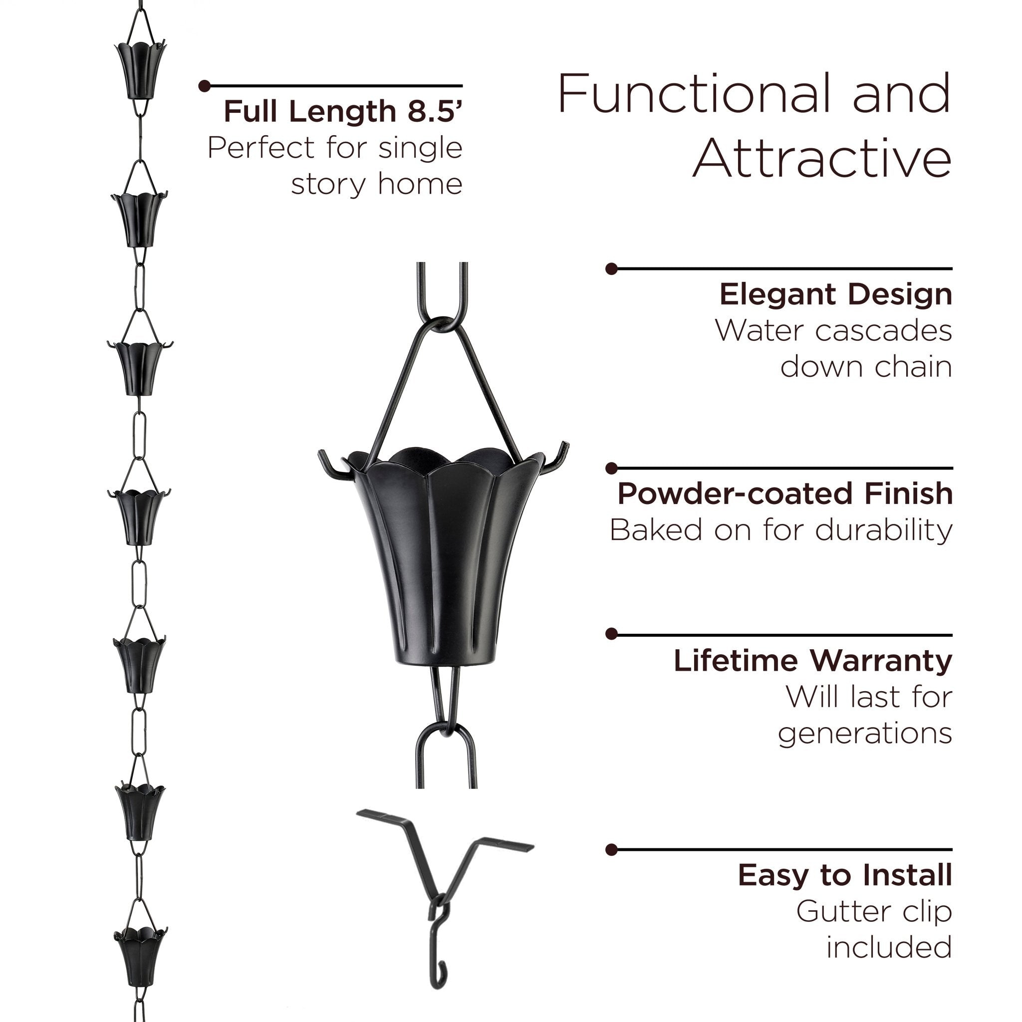 FUNCTIONAL DESIGN - at 8-1/2 long, this is the perfect size for a single story home. Need a longer length, don't worry, our rain chains can be easily connected to achieve any desired length.