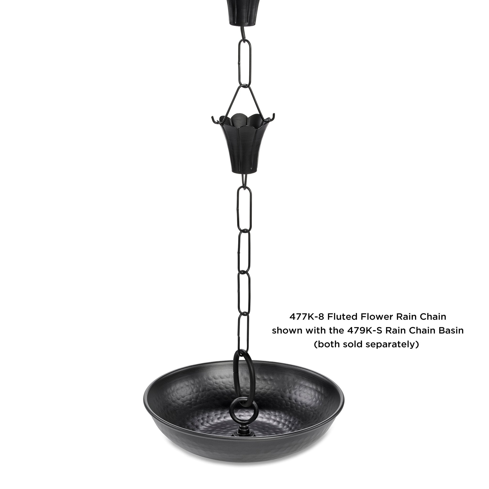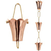 The Fluted Flower Rain Chain from Good Directions is artistically-designed and handmade to create a rain chain that is both beautiful and functional.  Eleven, 3-inch wide fluted flowers link together with black chain to form an 8.5-foot rain chain that promotes water flow and allows water to cascade beautifully from rooftop to ground. Each cup features flared petals that are carefully-crafted to promote a steady stream of water. You will welcome rain when you replace your ordinary gutter downspout with this inspired rain chain.  Our rain chains are built to last. Since 1982 Good Directions has been handcrafting works of art to enhance the homes of house-proud homeowners.