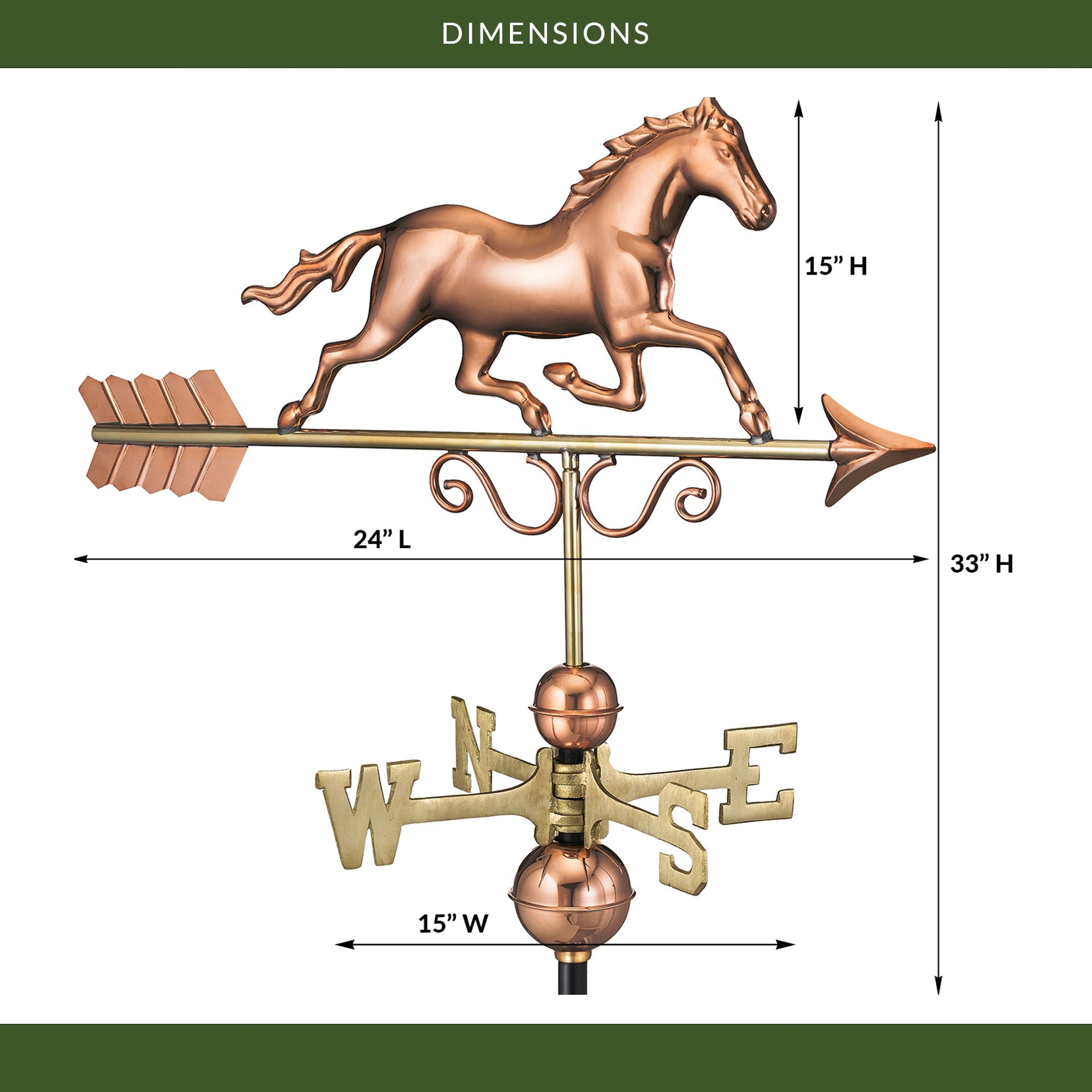 I ordered this horse weathervane to go on a new 22” cupola that I also purchased from Good Directions. I could not be more pleased. Both products are very well made, and absolutely beautiful. They were wonderful to work with and provided excellent service. I highly recommend this company.