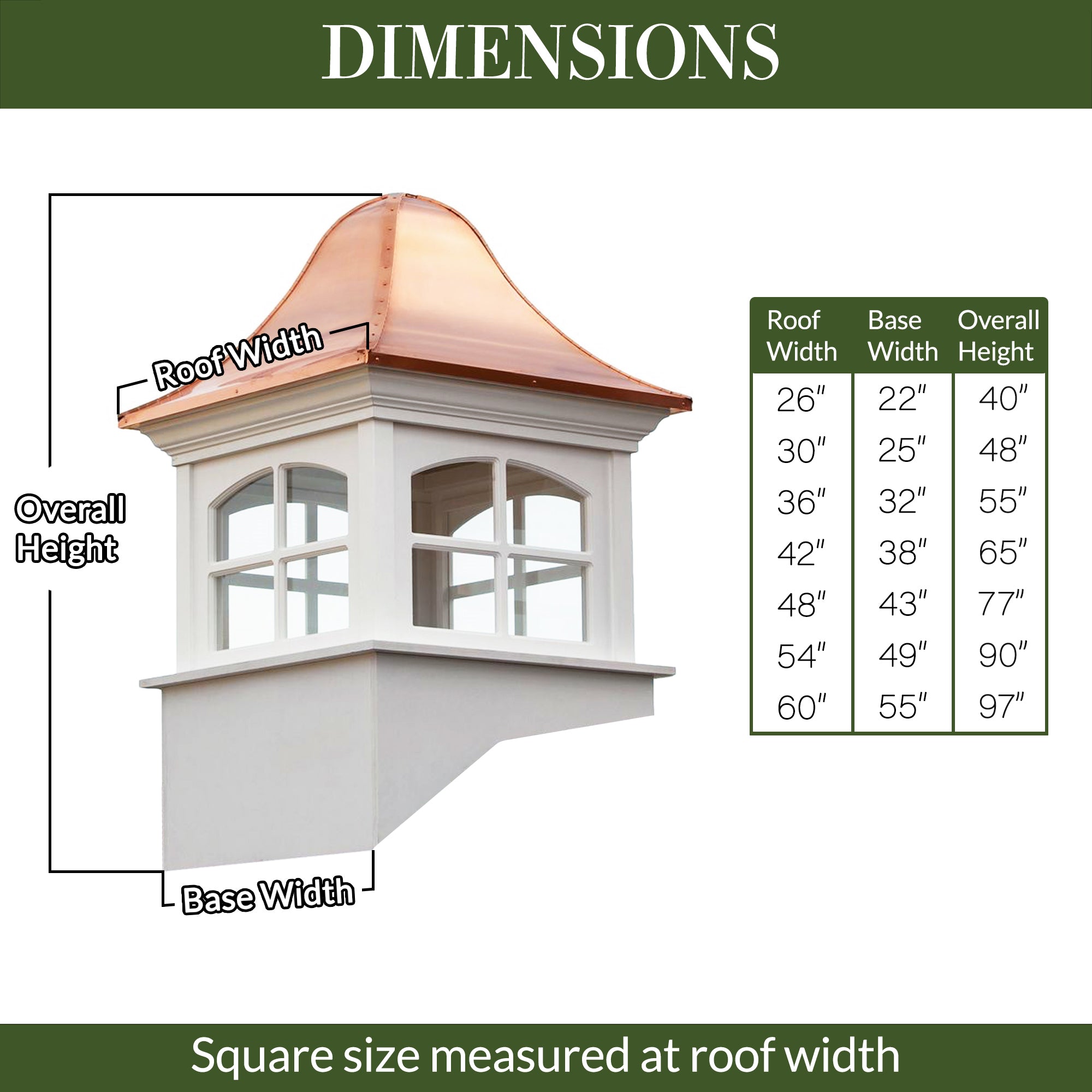 • Sizing & Features: DIMENSIONS – Square size measured at roofline. Fits up to a 10/12 pitch roof (most roofs). When calculating the size of your cupola, use our steadfast builder's rule of thumb: 1.5 inches of cupola width for every foot of unbroken roofline. See photo for more information.