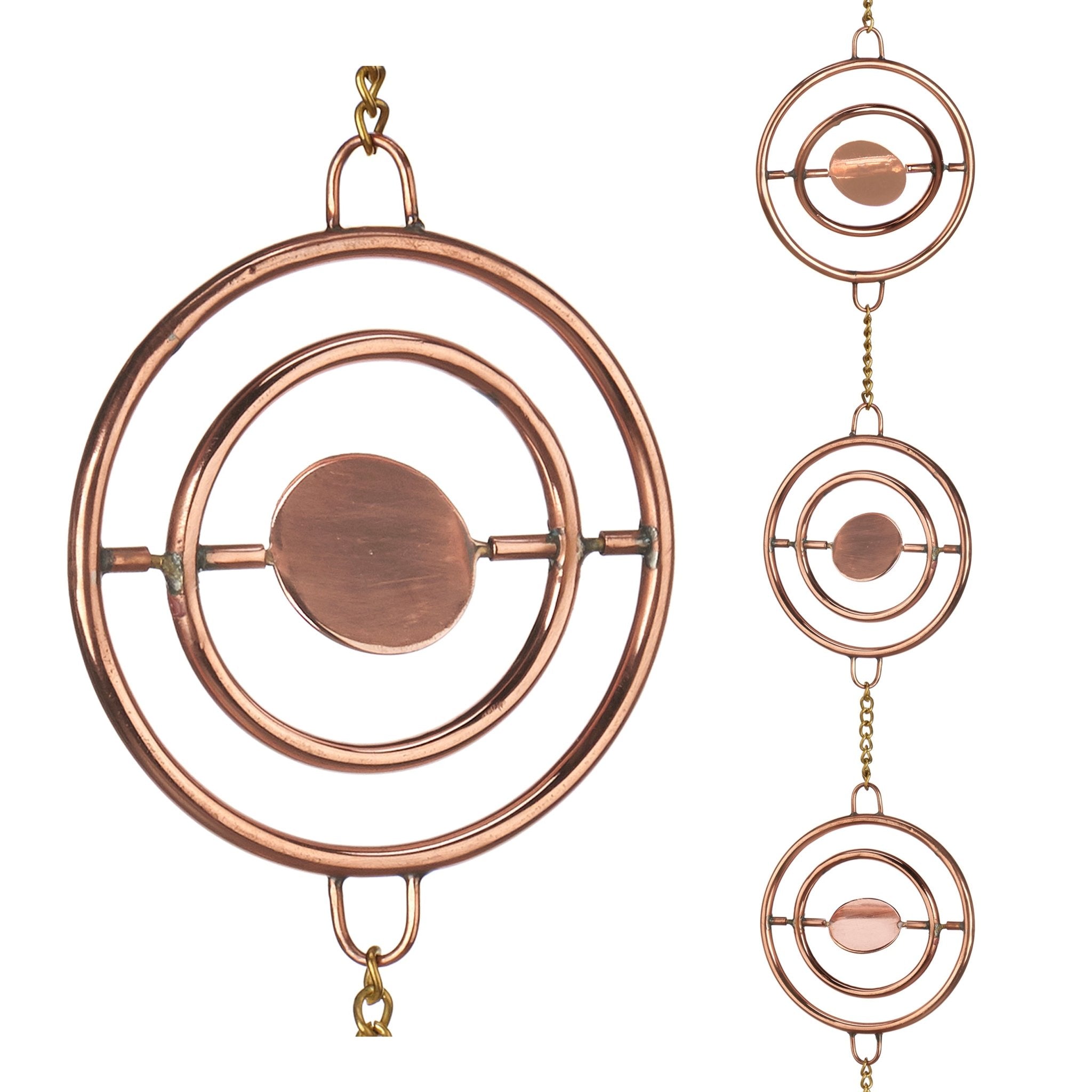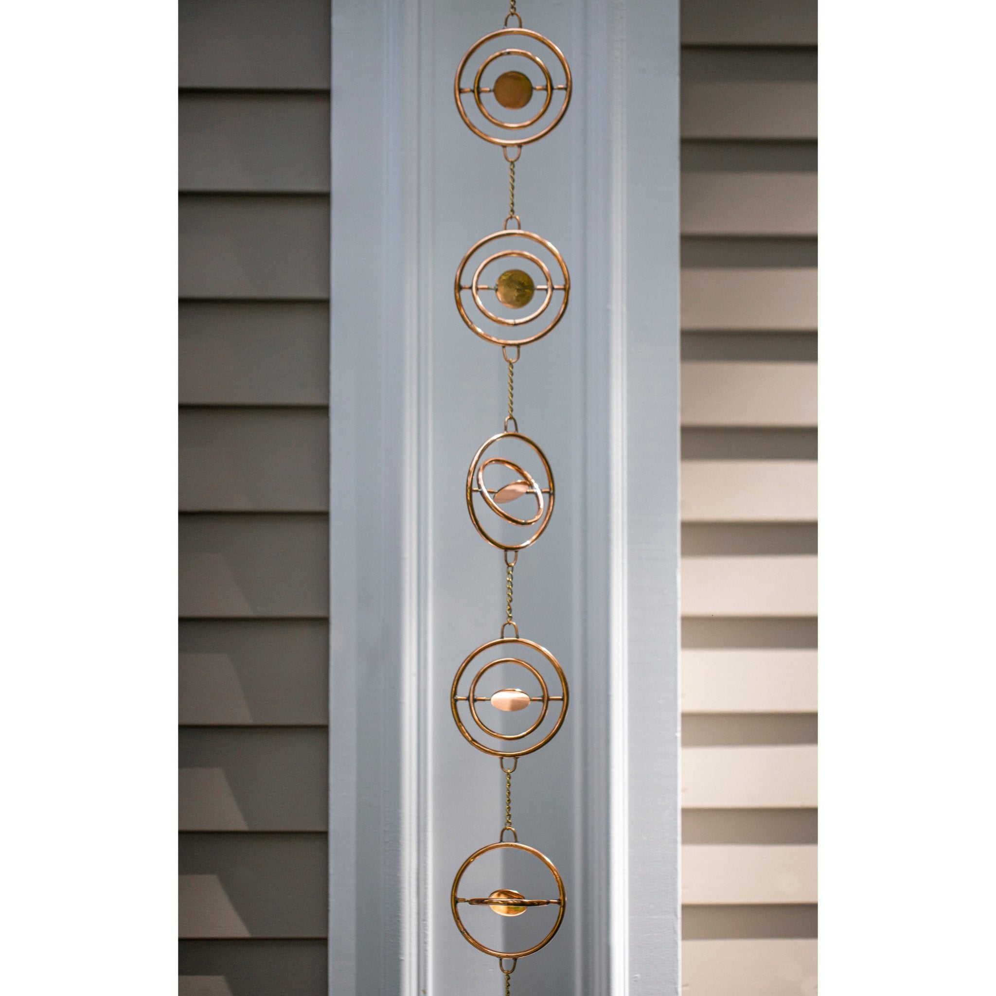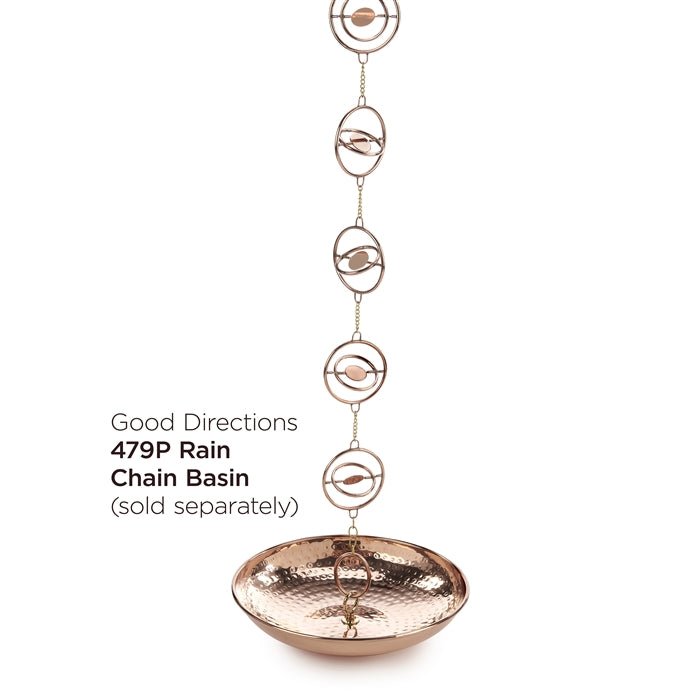 The Stellar Rain Chain from Good Directions is artistically-designed and handmade using pure copper to create a rain chain that is both beautiful and functional. Thirteen, rotating, 4.5 inch stellar rings link together with brass chain to create an 8.5-foot rain chain that allows water to cascade beautifully from rooftop to ground. Each orbiting ring is carefully crafted to revolve as water travels down.  For easy installation a gutter clip is included. You will welcome rain when you replace your ordinary gutter downspout with the Stellar Rain Chain. Our rain chains are built to last and are backed by an industry-exclusive Lifetime Warranty to ensure your satisfaction. For over 38 years, Good Directions has been handcrafting pure copper works of art to enhance the homes of house-proud homeowners.