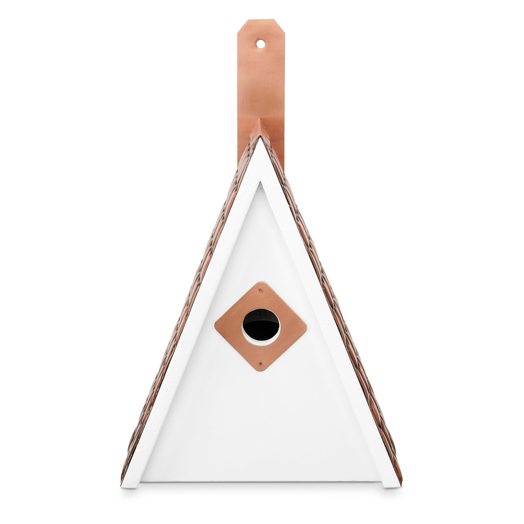 This unique creation is the ideal dwelling for songbirds. Designed with a durable structure, its sturdy body is masked by a beautiful face. The perch-less entry protects from nest-raiding paws, giving birds the freedom to enjoy this home. A generous 3” hole on back with sliding copper door makes clean-up a breeze.  Air vents circulate fresh air through the space and drainage holes are in the base. Our pure copper roof adds character and taste to long-lasting mango hardwood – coated in white paint. Perch-less 1.25” entry with copper guard protects from predators. Dimensions: 13.5″ H x 8″ W x 5″ D (10”H without mount).