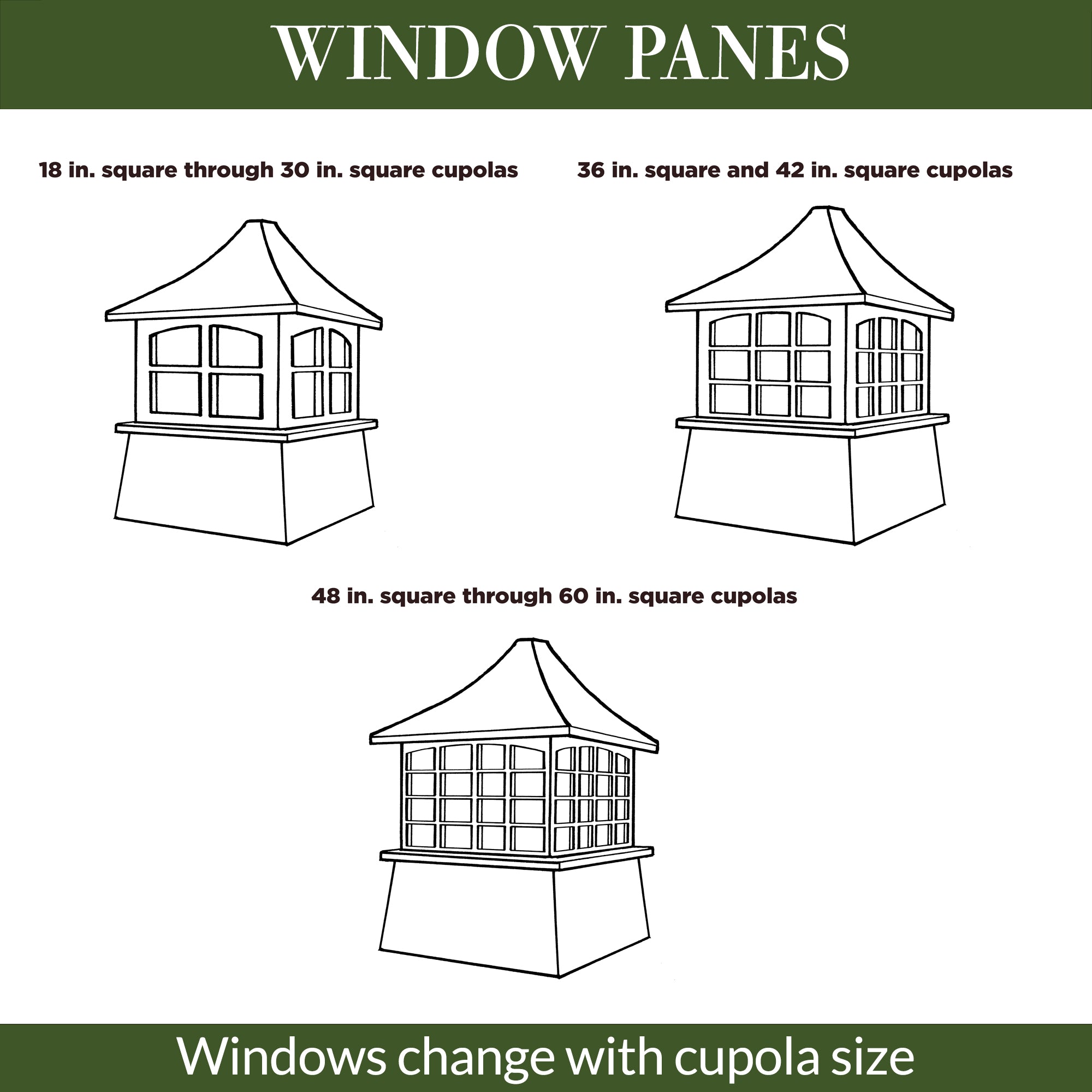 • Sizing & Features: DIMENSIONS – Square size measured at roofline. Fits up to a 10/12 pitch roof (most roofs). When calculating the size of your cupola, use our steadfast builder's rule of thumb: 1.5 inches of cupola width for every foot of unbroken roofline. See photo for more information.