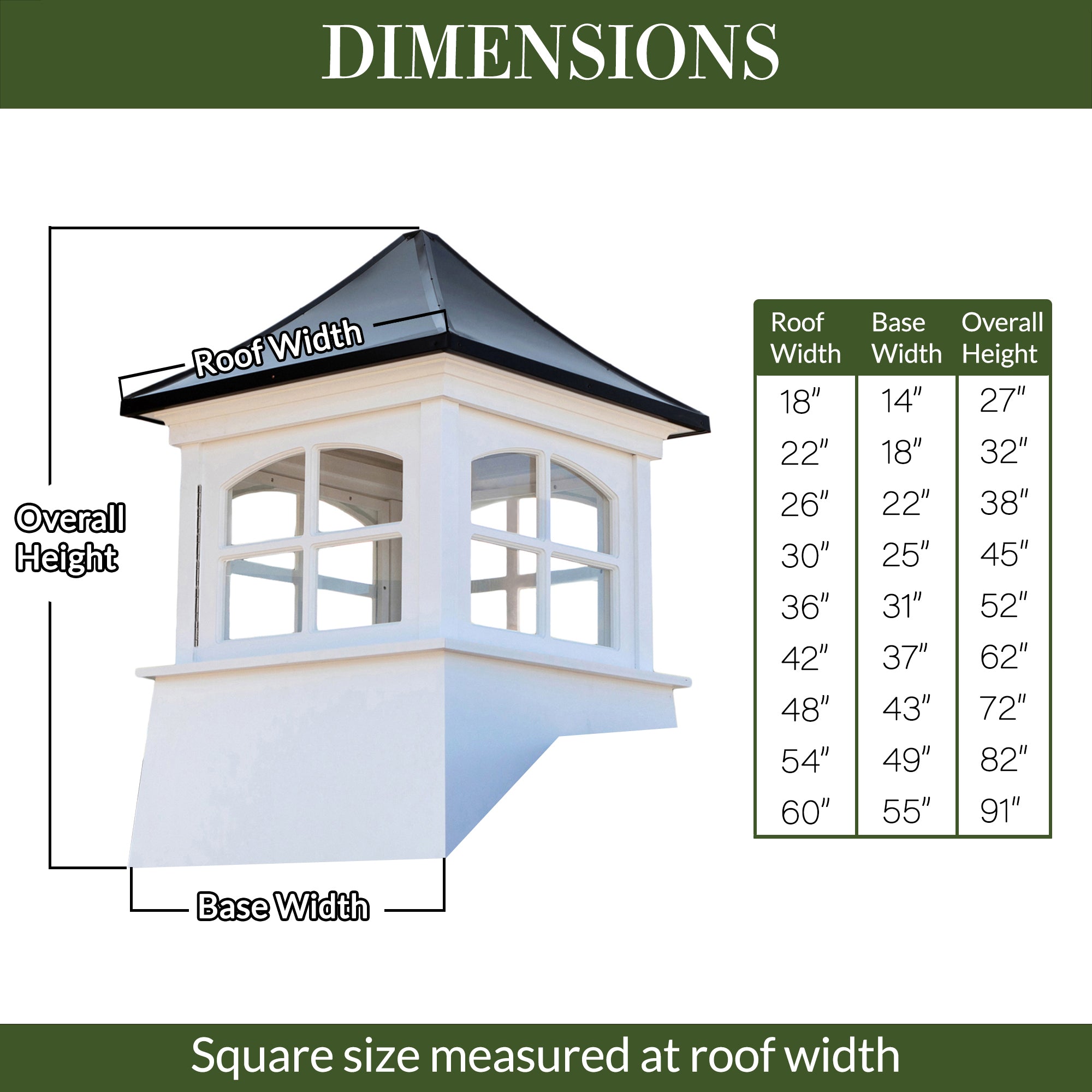 • Size Guide - Square size measured at your structure's roofline. When calculating the size of your cupola, use our builder's rule of thumb: 1.5 inches of cupola width for every foot of unbroken roofline.